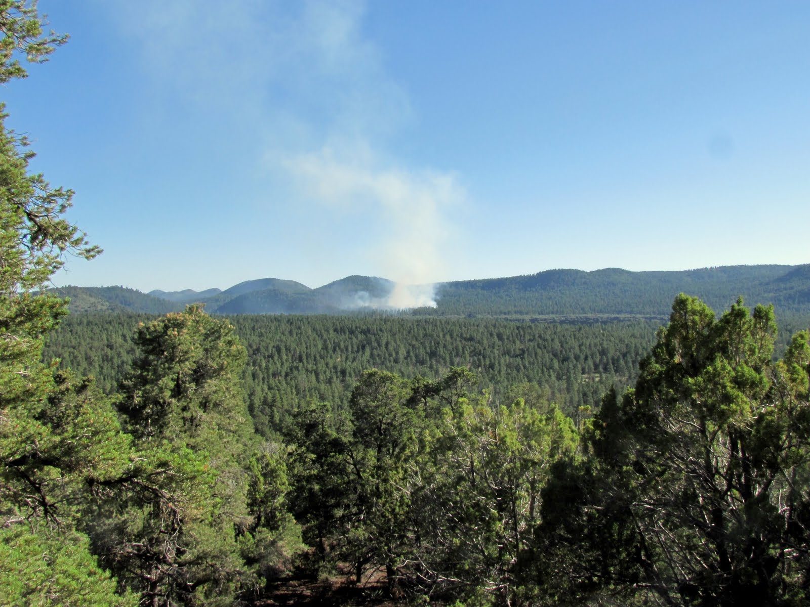 By the time I arrived at the trailhead leading up to Mount Trumbull, it was already past 4 in the afternoon. I still wanted to do some birding, though it was hot and quiet. A bit of excitement came when I was at the trailhead and noticed a few White-throated Swifts overhead. Suddenly I heard the tearing sound of wings moving very fast through the air – and looked up to see a Peregrine Falcon pursuing a swift. It missed, and dove once more half-heartedly before taking off. I headed a short way up the trail, enjoying the view and a few birds. One that caught my attention was a screeching raptor call that left me puzzled – not a Red-tail, and not the right habitat for Swainson’s or Ferruginous. I wasn’t able to spot it, so I continued on. On my way up, I had noticed a small plume of smoke coming from the area. It turned out to be a small wildfire on Mount Logan, which was burning at a low intensity under the control of firefighters. I have been around a fire like this before – the Warm Fire on the Kaibab Plateau in 2006 – which ended up burning out of control and toasting over 50,000 acres. This made me just a tad nervous. Still, fire is an essential part of this ecosystem, and it was interesting to see natural processes at work.