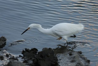 | Fishing Snowy Egrets are a common sight on Beal Lake. |