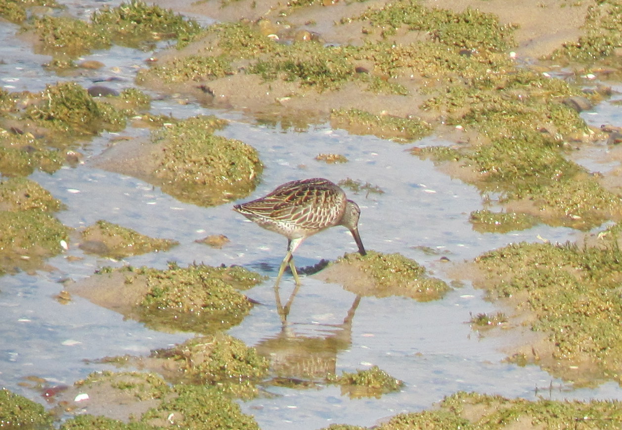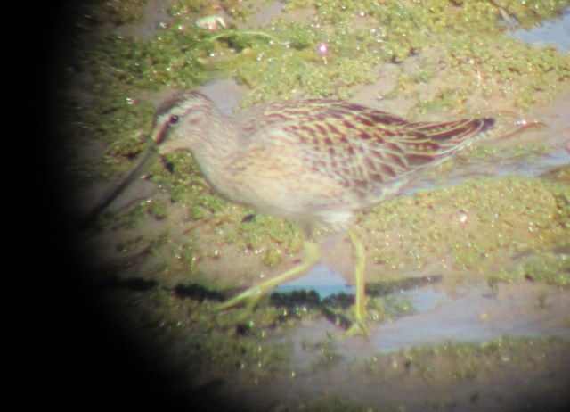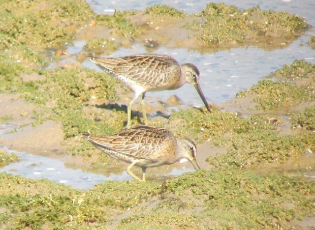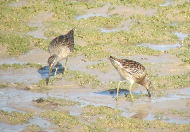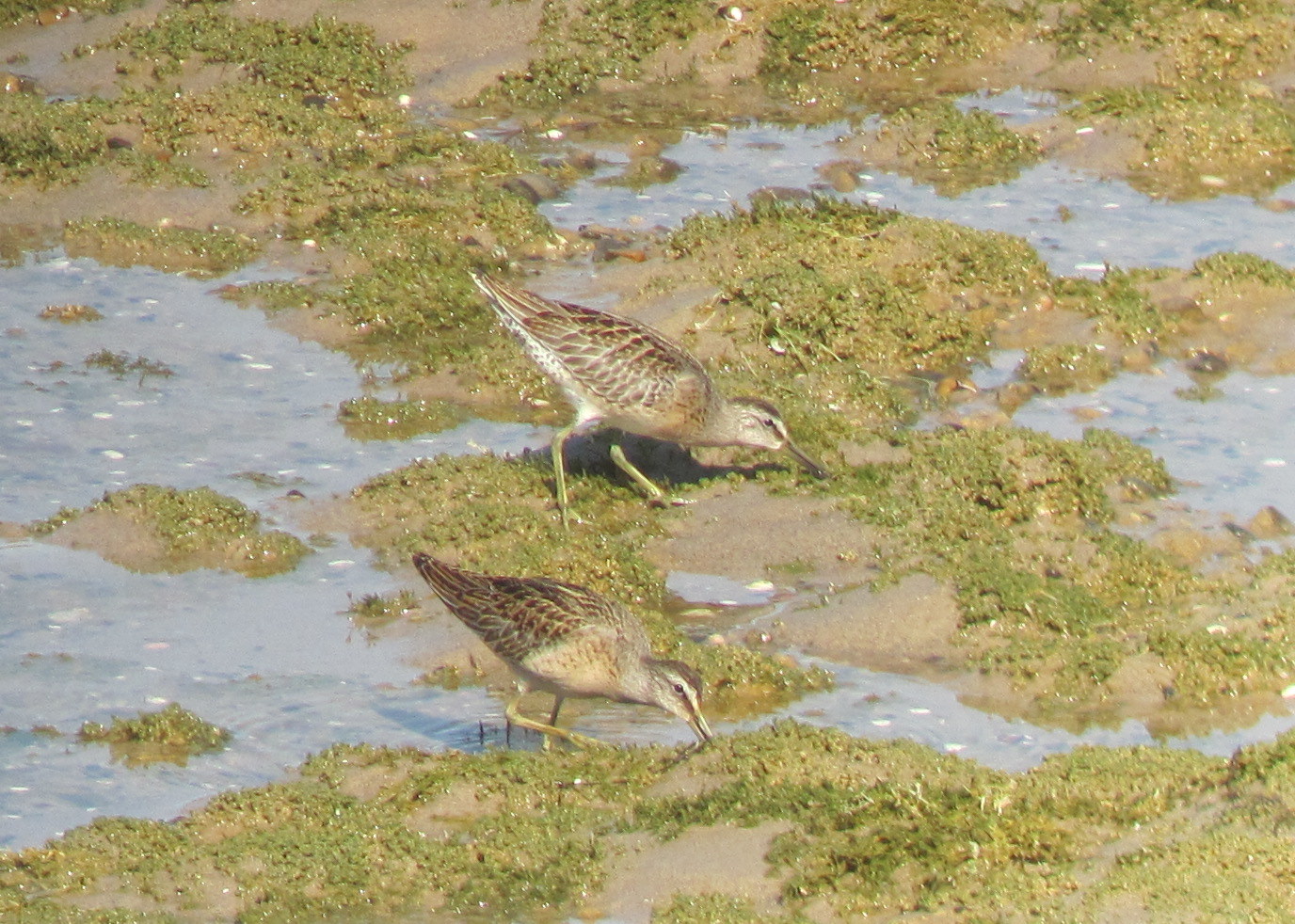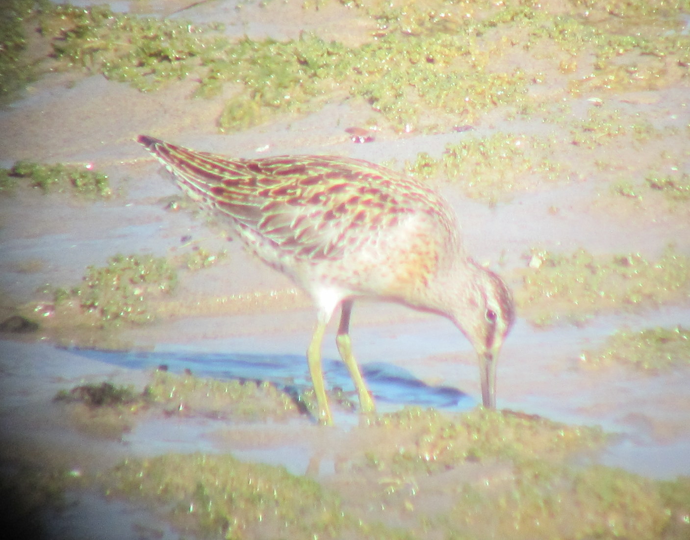 While Beal Lake is not ideally suited for photography (bad light and distant birds are the rule), I did manage to photograph several of the Short-billed Dowitchers along the river today.  Several are below.  These birds are all juveniles – adults would be obvious with mainly reddish underparts.  Note the reddish blush on the breast, a good mark for juvenile Short-billed Dowitcher, as well as general shape.  The most important mark visible in the photos is the well-patterned wing coverts and tertials.  On juvenile dowitchers, rufous internal markings on the tertials is a great ID clincher – but note that it only works for juveniles.  Not visible in photos is the call note – a “tututu” reminiscent of yellowlegs, very different from the frequent “kik” calls of Long-billed.
