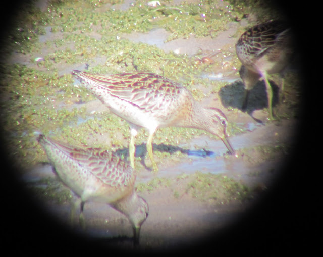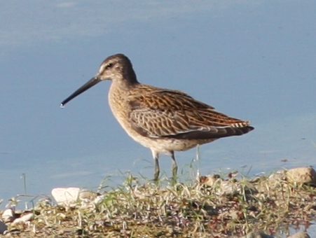 As I mentioned in my Beal Lake post, we have had quite a few Short-billed Dowitchers in the area lately.  Our first was at the Island STP August 24.  The next day, David and I counted 18 on Beal Lake.  Today, we counted 16 there, plus another 27 along the Colorado River in a 4-mile stretch near the CA/NV/AZ state lines.  A total of 43 Short-billed Dowitchers, with only ONE Long-billed!  Rosenberg et al. lists Short-billed Dowitcher as rare but regular in fall, with a high count of 13 between Parker and Lake Havasu.  Perhaps the real surprise, then, is not the number of Short-bills but the scarcity of Long-bills.  Hopefully, continued coverage this season and in subsequent years will tease out the status of both species.