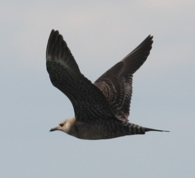 These photos show the most important marks for Long-tailed Jaeger – lack of cinnamon tones in the plumage, bold black-and-white barring on the undertail coverts, two white primary shafts, boldly marked underwing coverts, whitish tips to upperwing coverts, and especially the two long central tail feathers. The bill does look a little large for LTJA – remember that was one of the confusing features I mentioned in my earlier post – and just shows how important it is to note multiple features in juvenile jaeger ID!
