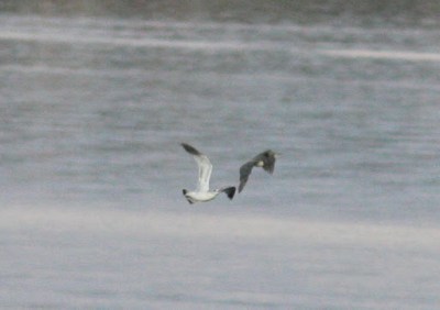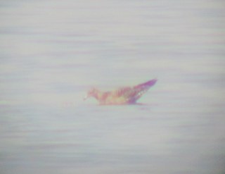 First, remember the Long-tailed Jaeger from my last post? Since that sighting, we were having continual sighting of distant jaegers identified as “probable Long-tailed”. I was getting pretty sick of jaegers after a while. Finally, though, David managed to get some good, identifiable photos of a Long-tailed Jaeger. Then, David and I spotted the bird sitting on the water not far off Pittsburgh Point. It was gorging on a dead fish. We were puzzled when it flew up into a cove and out of sight, and we couldn’t refind the bird! I scanned from a rocky ridge while David walked the shoreline, both of us trying to turn up this bird. Eventually David gave up and started walking up the next ridge over, only to see the jaeger sitting on top of the ridge! David having inadvertently flushed it, the bird flew back to its dead fish–and right over my head. I mean if I had stretched out my arm I could have pet this bird’s belly. With the jaeger back at its fish, I digiscoped some better photos.