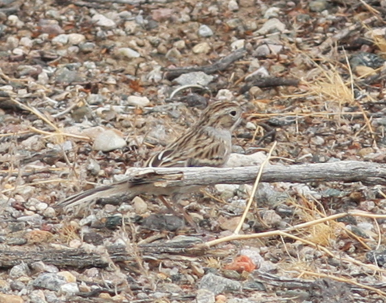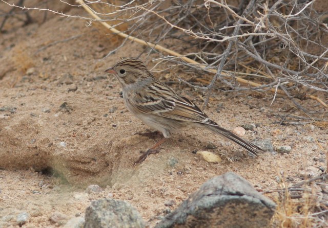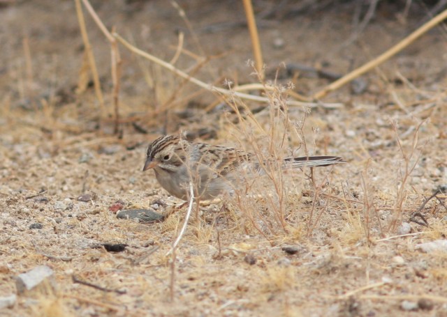 The Cassin’s Sparrow I saw yesterday was in Mohave, at the north end viewpoint. This was a very surprising find, with the bird not only out of range but in unusual habitat. I came around a corner to see a sparrow feeding on the edge of some dense vegetation on the lake shore. Thinking it would be a Brewer’s Sparrow, I got my binoculars on it in time to see a scaly pattern on the back and crown, and I knew it was a Cassin’s Sparrow. It disappeared into the brush as soon as it saw me, peeking out only for a moment so I could see a distinct eye-ring. I then waited and waited, staring at the brush pile and trying to ignore all the Brewer’s and Chipping Sparrows, Orange-crowned Warblers, and other birds flitting all around me. Eventually, the Cassin’s Sparrow did come out, and I managed to get some decent photos.