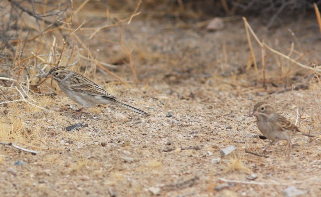 Birding along the state line between Arizona and California produces some interesting patterns. One thing we have noticed is that sometimes, you see a bird that is a much more interesting record on one side of this imaginary line than the other. Neotropic Cormorant is one example–they always seem to turn up in Arizona, but they are a Review Species in California. Similarly, a jaeger on the California side is a good bird for the inland counties, but all three jaegers are Review Species in Arizona. Yesterday, I saw one of these species: a Cassin’s Sparrow. While this species is common in southeastern Arizona, there are few records for the northern and western regions of the state. Rosenberg et al. only lists one record from the LCRV, in La Paz County. This summer, David and I found the first in Mohave County – around Peach Springs, we had several singing birds. This was a good year for them in northern Arizona, with reports across the northern tier of the state. Across the lake in California, Cassin’s Sparrow is a Review Species. There have been several records of singing and even breeding birds in San Bernardino County, but only in very good years.