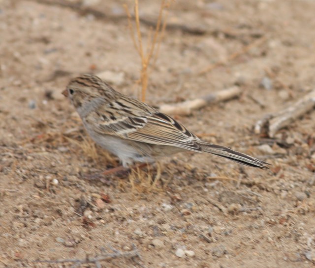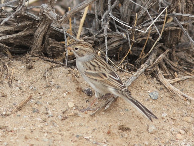 | Just for fun, I think this is one of those well-marked Brewer’s Sparrows that shows a central crown-stripe. Or maybe it’s another Clay-colored… |