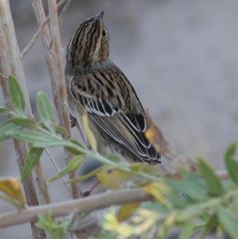 On Sept 9, I encountered a flock of Spizellas that seemed to be mixed Clay-colored and Brewer’s. Being inexperienced with fall Clay-colors, I just started snapping photos of every bird I could get close to. Later I examined the photos and read up on Spizella identification. An excellent article by Peter Pyle and Steve Howell can be found in Birding 28:5 (Oct 1996), “Spizella Sparrows: Intraspecific Variation and Identification”. After reading this article and other information on Spizella ID, studying my photos and grouping photos of individuals based on individual feather patterns, I concluded that I had photographed four Clay-colored Sparrows in this flock. As Brewer’s Sparrow migration has continued, I have come to appreciate the range of variation that this species shows. Many of the birds I encounter have gray napes and broad supercilia only slightly marked with streaks, as well as distinct dark lateral throat-stripes. The mark that these birds do not show is the distinct pale central crown-stripe.
