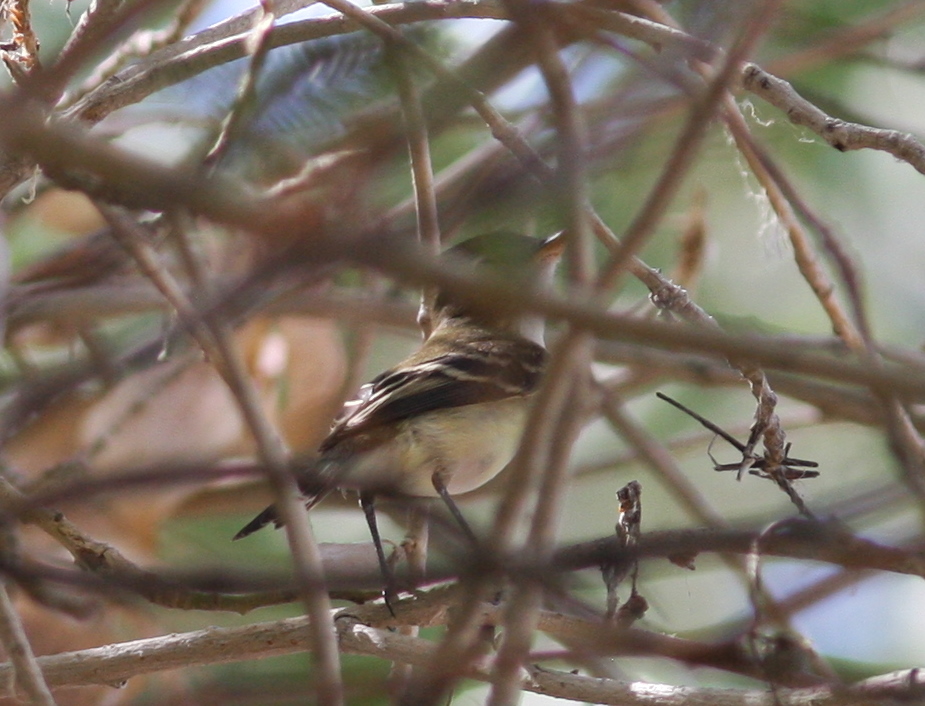 Empidonax flycatcher giving a “whit” call. Typically the only two species that give such a call in the LCRV are Willow and Gray Flycatchers. Once I got a brief view of the bird, I could see that it wasn’t a Willow, and the bill wasn’t right for Gray. I tried to get a better view, thinking it may be a Dusky, a fairly rare bird in the LCRV. Eventually the bird sat in the open for a moment, and I saw very contrasty wings, and odd tail-flicking behavior – it was flicking its tail quickly down. Both are features of Least Flycatcher. David and I spent the next few hours trying to get good views of the bird, and David finally managed to get some decent pictures. It’s the bill that clinches the ID – the long narrow bill with about a substantial dusky tip points to Dusky Flycatcher, not Least. Not the rarity we would have liked, but still a good bird!