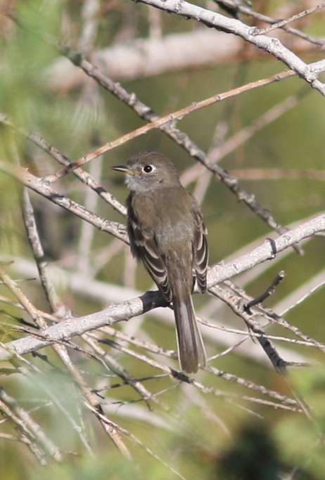 | Dusky Flycatcher. The short primary projection and long tail are visible in the photo; it was also giving a “whit” call in the field. |
