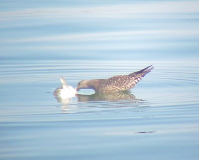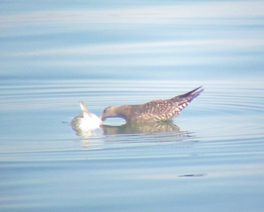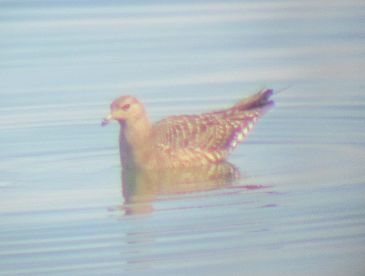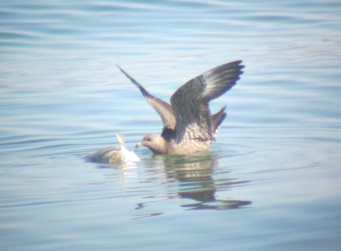First, remember the Long-tailed Jaeger from my last post? Since that sighting, we were having continual sighting of distant jaegers identified as “probable Long-tailed”. I was getting pretty sick of jaegers after a while. Finally, though, David managed to get some good, identifiable photos of a Long-tailed Jaeger. Then, David and I spotted the bird sitting on the water not far off Pittsburgh Point. It was gorging on a dead fish. We were puzzled when it flew up into a cove and out of sight, and we couldn’t refind the bird! I scanned from a rocky ridge while David walked the shoreline, both of us trying to turn up this bird. Eventually David gave up and started walking up the next ridge over, only to see the jaeger sitting on top of the ridge! David having inadvertently flushed it, the bird flew back to its dead fish–and right over my head. I mean if I had stretched out my arm I could have pet this bird’s belly. With the jaeger back at its fish, I digiscoped some better photos.