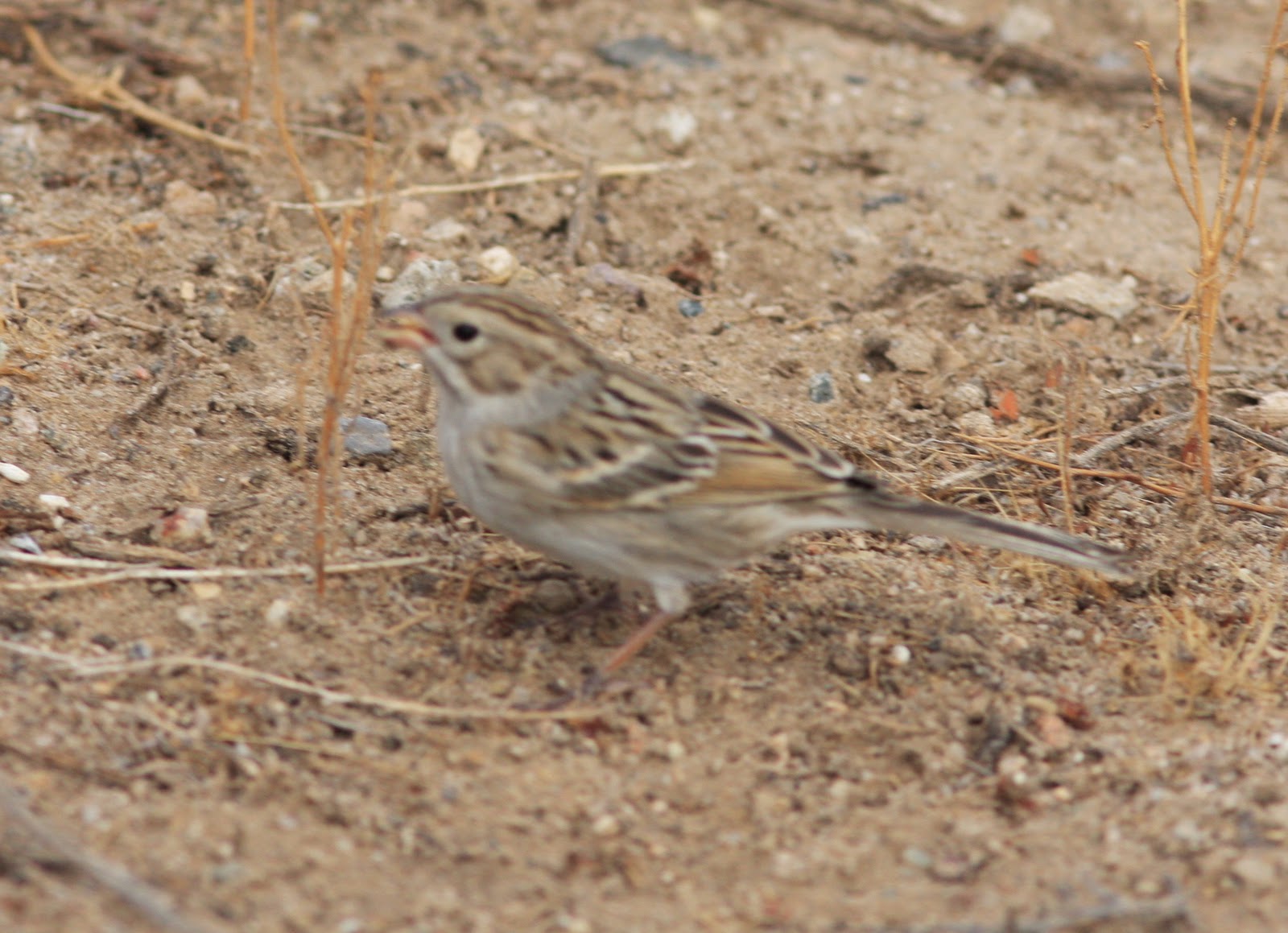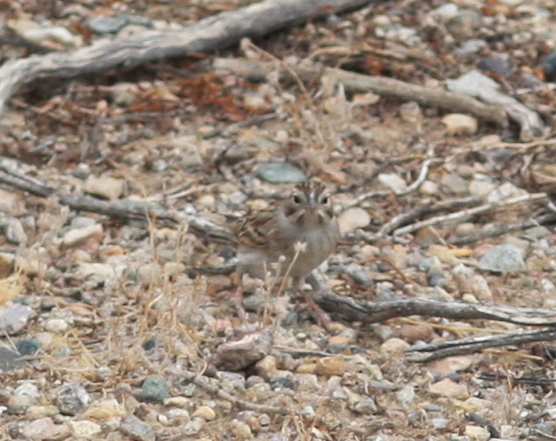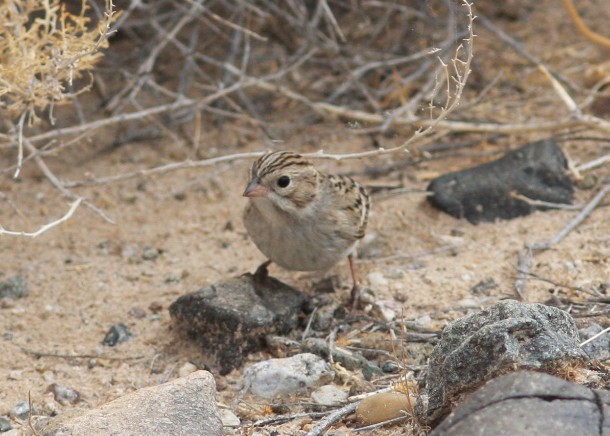 | Just for fun, I think this is one of those well-marked Brewer’s Sparrows that shows a central crown-stripe. Or maybe it’s another Clay-colored… |