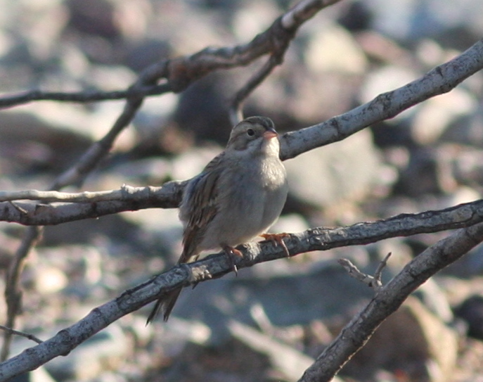 The Cassin’s Sparrow I saw yesterday was in Mohave, at the north end viewpoint. This was a very surprising find, with the bird not only out of range but in unusual habitat. I came around a corner to see a sparrow feeding on the edge of some dense vegetation on the lake shore. Thinking it would be a Brewer’s Sparrow, I got my binoculars on it in time to see a scaly pattern on the back and crown, and I knew it was a Cassin’s Sparrow. It disappeared into the brush as soon as it saw me, peeking out only for a moment so I could see a distinct eye-ring. I then waited and waited, staring at the brush pile and trying to ignore all the Brewer’s and Chipping Sparrows, Orange-crowned Warblers, and other birds flitting all around me. Eventually, the Cassin’s Sparrow did come out, and I managed to get some decent photos.
