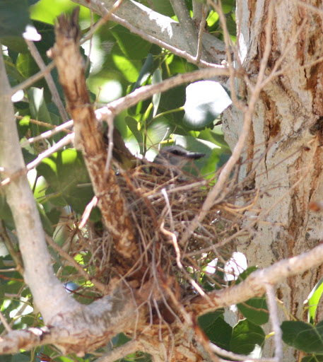 Despite temperatures creeping into triple digits at this point, we decided to make a quick stop at ‘Ahakhav Tribal Preserve to check on the Tropical Kingbirds. This pair returned to the same spot where they raised two chicks last year, and had already been found nest-building in May. More recently, incidentally, the pair at Pintail Slough returned to their territory as well. Since we hadn’t had any recent news on the ‘Ahakhav birds, we wanted to find out how they were doing. Long story short: three chicks in a nest!