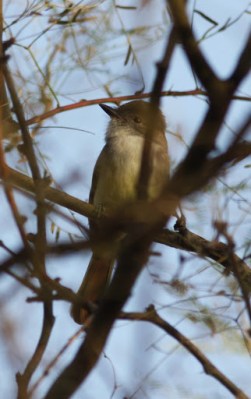 Just after 8:00 this morning, after about 15 minutes of birding, I was walking down the road at Mosquito Flats in Bill Williams River NWR, planning out my post to the listserv about the continued absence of the Nutting’s Flycatcher.  Of course it was at that moment that I heard that singular “WHEEP!”  I didn’t think I had missed it so much, but that sound brought a huge smile to my face. It’s back!