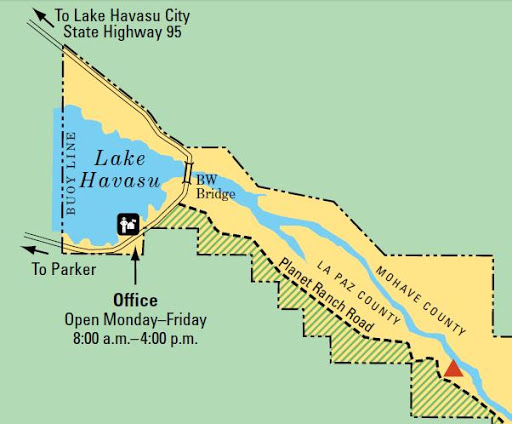 On the map above, note the location of the visitor center, a good place to stop in for information. It’s also a good place to scan the Bill Williams Delta, also known as the Bill Williams Arm of Lake Havasu. Just down the road east of the headquarters, marked in both directions by brown binoculars signs, is the entrance to Planet Ranch Road.