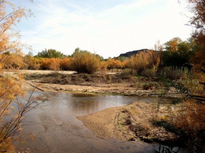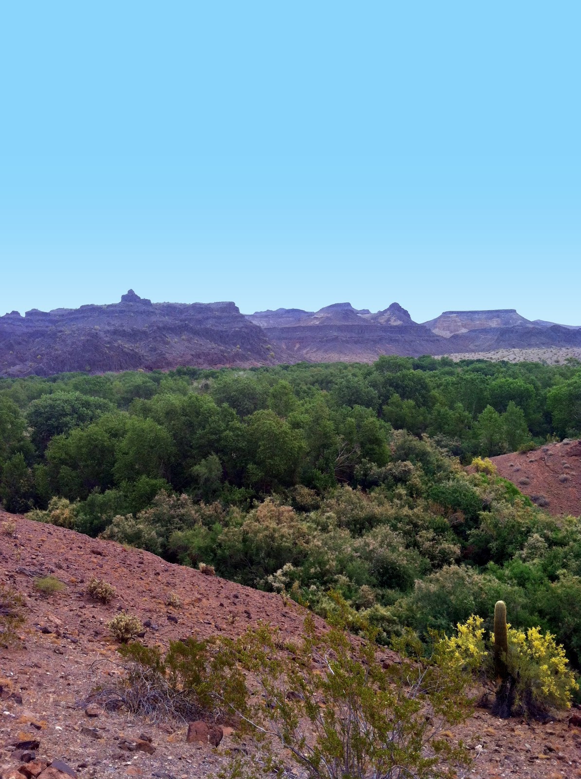 | Sonoran desert and cottonwood/willow/mesquite riparian come together on the Bill Williams River. This photo was taken just after the gate on Planet Ranch Rd. |