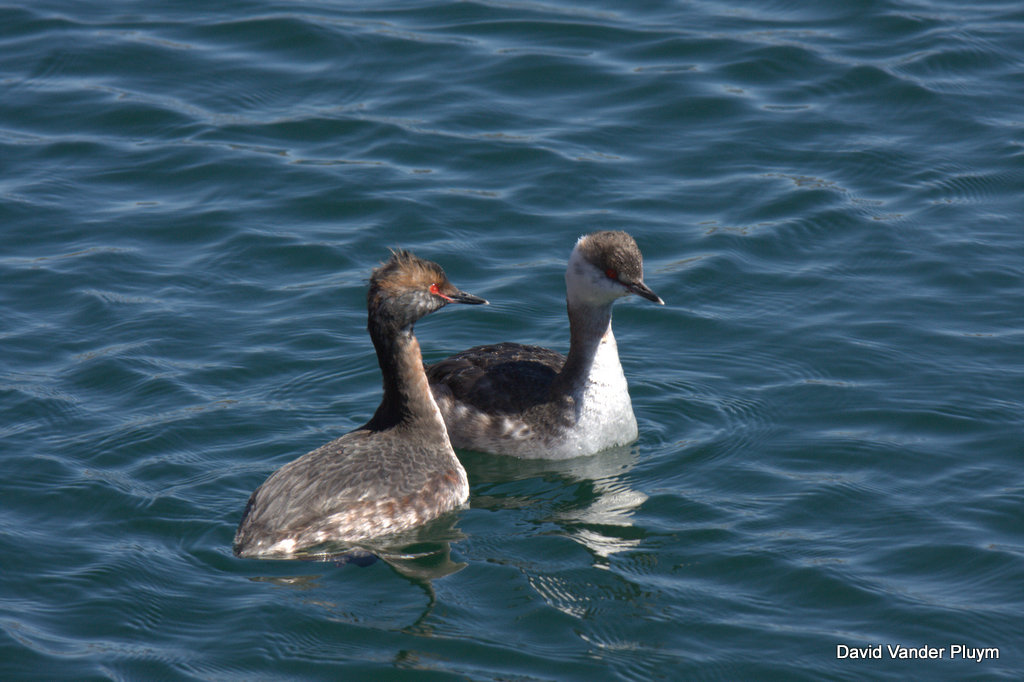 These two Horned Grebes were actively calling and engaging in the start of courtship. Though one is largely in basic plumage and the other is largely in alternate note that they share the same structure of thick necks and bills, helpful for IDing birds in transitional plumages. These birds were at Havasu Springs Resort, LP, Arizona. Copyright (c) 2013 David Vander Pluym