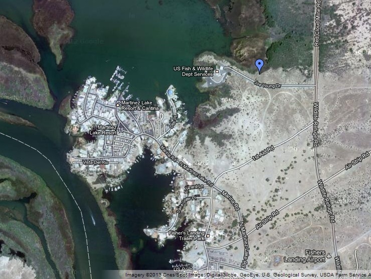 An overview of both Ferguson and Martinez Lakes. Ferguson is rarely visited as it is down a long dusty road with lots of private property around it. Swallows may roost there but overall Martinez Lake offers better views and is easier to get to. The blue marker represents a good place to view from. See also the next map.